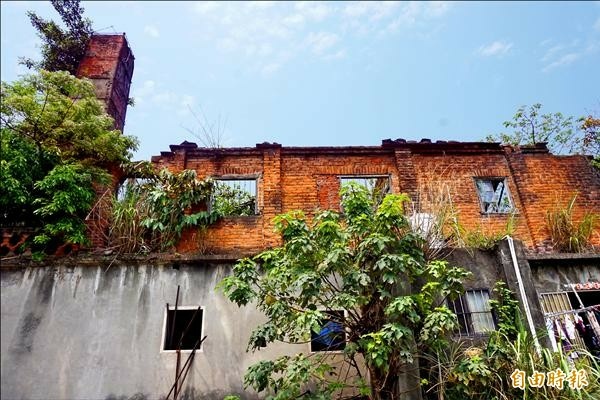 烘爐窯位於文化路213巷內,歷史約90年,煙囪已遭榕樹貫穿,女兒牆有多處裂隙,恐有塌陷危機。(記者張安蕎攝)
