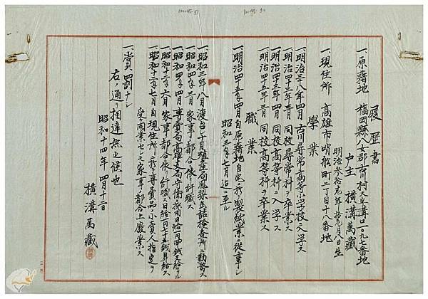 橫溝萬藏, 明治31年(1898)11月8日生,本籍日本福岡縣八女郡古川村大字溝口1097番地,現住地高雄市三塊厝1082番地。