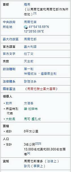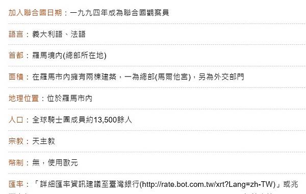建國簡史/歷史概況:「馬爾他騎士團」(Sovereign Military Order of Malta)總部設於羅馬,為地位相當特殊之國際法人,擁有主權地位(Sovereign Status),可發行郵票,核發護照,一九九四年起成為聯合國常任觀察員。該團羅馬總部領土為一萬二千平方公尺,具政府組織並享有派遣接受使節之權。