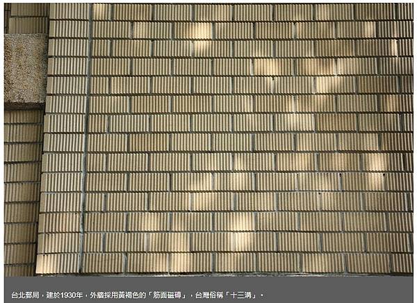 「十三溝面磚」正式名稱其實是「筋面磁磚」,大約是在大正年間到昭和初期(約1920-1935)相當流行貼附磁磚作為建築物外觀之裝飾,溝痕(又稱山筋)其實不只有13條一種,另外還有19條、25條等等,溝痕形狀也還有大山形、丸山形、凹丸形、Tape等類型,到昭和初期,筋面磚在日本本土慢慢退了流行,使用率大幅降低,但在臺灣公共建築卻仍持續使用。