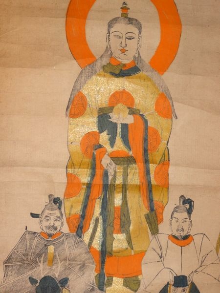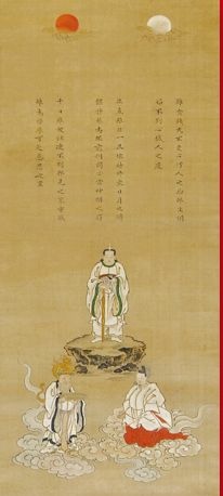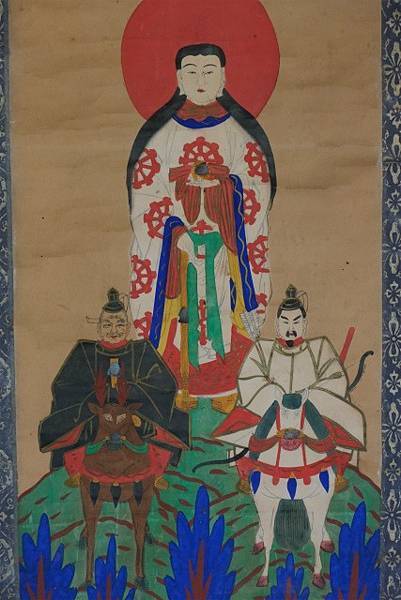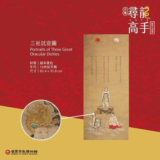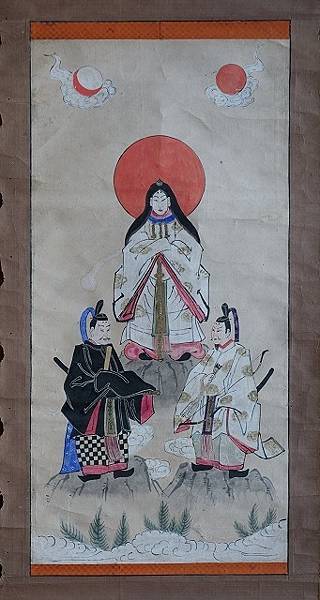 「三社託宣圖」展現了日本三大古神社的主神-天照大神、春日大神與八幡神一三神的樣貌,最獨特的地方在於三神的面貌皆以融合佛教神明的姿態呈現,而非祂們原來的形象。三大主神以勸人為善、心存仁慈與不受金錢誘惑為旨。