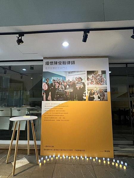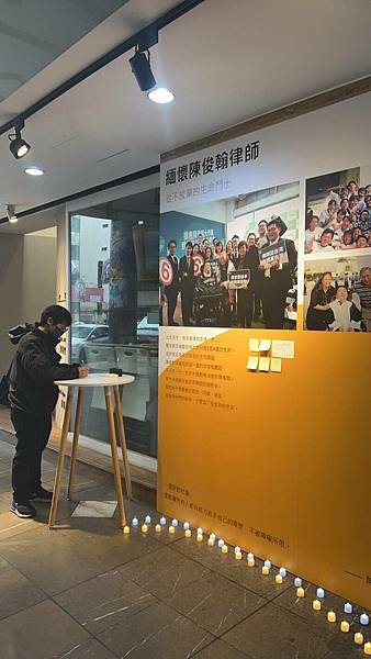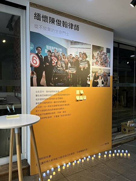 李妍慧說,在陳俊翰家屬同意下,取得陳俊翰生前珍貴生活照,並在陽明交大機械所志工鍾同學規劃設計協助下,在最短時間於「32π青年基地」布置完成,23日下午完成追思陳俊翰律師連儂牆。