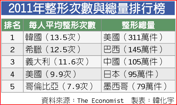 不過,若是以平均每萬人整形比例來算,南韓以131件排名第一,等於平均每77個韓國人就有一個人整過形,其次為義大利(116件)與美國(100件)。