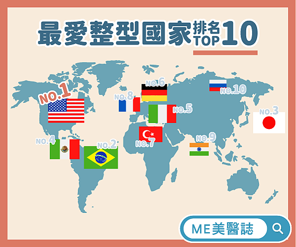 就國際美容整形外科學會(ISAPS)發表的資料顯示,最愛整形的國家排名前10是美國、巴西、日本、墨西哥、義大利、德國、土耳其、法國、印度和俄羅斯,其中唯一的亞洲國家只有日本上榜。而美國和巴西擁有人數最多的整形外科醫生,占世界整形外科醫生總數的25%以上,亞洲國家緊隨其後,排名3到5位的分別是中國、日本和韓國。這個結果似乎有點出乎意料,人人都知道的整形大國韓國居然位居十名之外,讓人驚訝原來西方人才是最愛整形的。