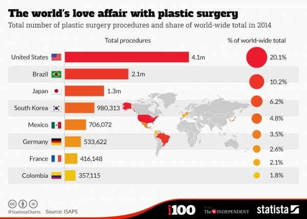 對許多人來說,可能會對整型手術在韓國人受歡迎的程度感到驚訝,這個行業在當地蓬勃發展。若把人口納入考慮,則韓國進行整型手術的人是最多的。在2011年,每77名韓國人中就有一人接受過一種整型手術。去年在首都首爾,20%的19至49歲的婦女承認動過整型手術。