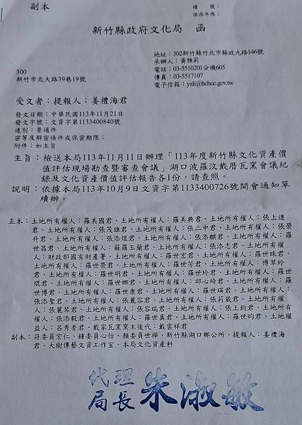 依據:文化資產保存法第18條、歷史建築紀念建築登錄廢止審查及輔助辦法第4、5條暨114年3月18日「新竹縣第三屆古蹟歷史建築紀念建築聚落建築群史蹟及文化景觀審議會第5次會議現場勘查及審議會議」決議事項辦理。