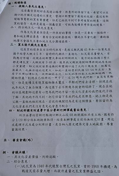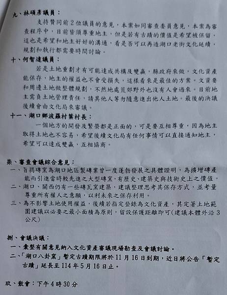 林姓等民眾也發言,新湖地區過去是新竹縣磚瓦窯業最盛區域,今日卻幾無遺跡可尋。湖口鍾家磚窯是最後一座磚窯,由桃園楊梅鍾家租賃,反映桃竹客庄區域特性;1961年興建登窯,1971年因增產而改建為圓環窯,以海山煤礦為原料,1981年停產後閒置,可謂客庄製磚產業興的時代縮影。