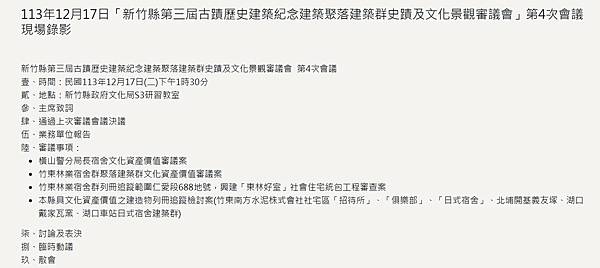 113年12月17日「新竹縣第三屆古蹟歷史建築紀念建築聚落建築群史蹟及文化景觀審議會」第4次會議 現場錄影 - 新竹縣政府文化局