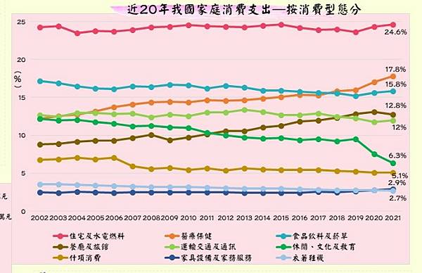 2022年家庭消費支出占GDP比率最高的10個國家如左上圖所示,其中以約旦、菲律賓及哥倫比亞占比超過7成以上,台灣占GDP的45.5%,鄰近的日本、韓國、中國分別占GDP的53.9%、48.4%及38.2%。