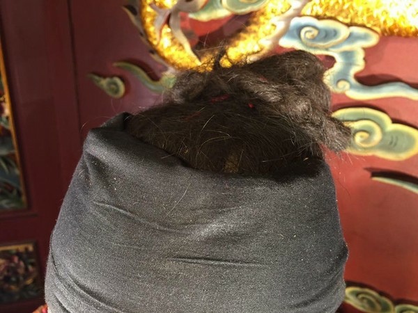 ▲媽祖帽子裡的秘密,整齊髮髻是真人頭髮。(圖/翻攝自國家第三級古蹟~新竹長和宮粉絲專頁)