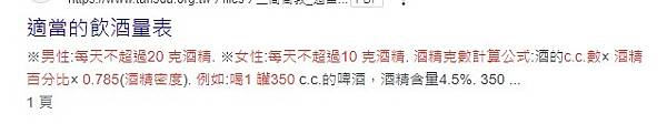 10(1個酒精當量的酒精克數)/ 酒精百分比 / 0.785(酒精密度)= 該酒品建議攝取量