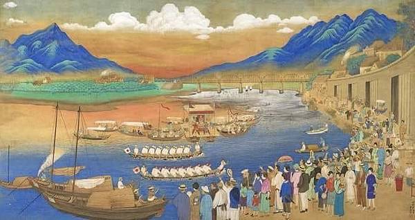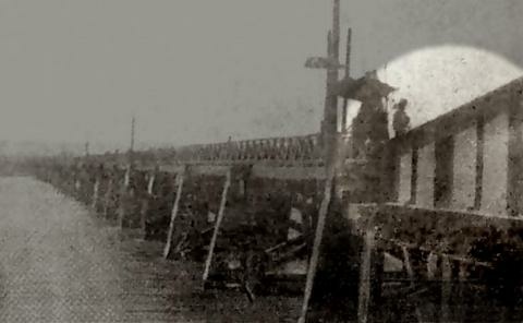 1889年清末完成的第一代木造臺北橋。當河道有船隻通行時,右邊亮光處鋼梁可旋轉