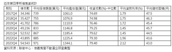 根據聯徵中心最新資料顯示,去年第四季國人申請房貸統計,平均購屋總價達1344萬元,房價再創歷史新高,平均貸款金額970.5萬元也同步寫下新高,不過購屋面積卻是追平歷史新低的43坪,購屋的核貸成數中位數達79.4%,顯示過半民眾的房貸成數已經超過79%,貸款8成已經是普遍的現象。