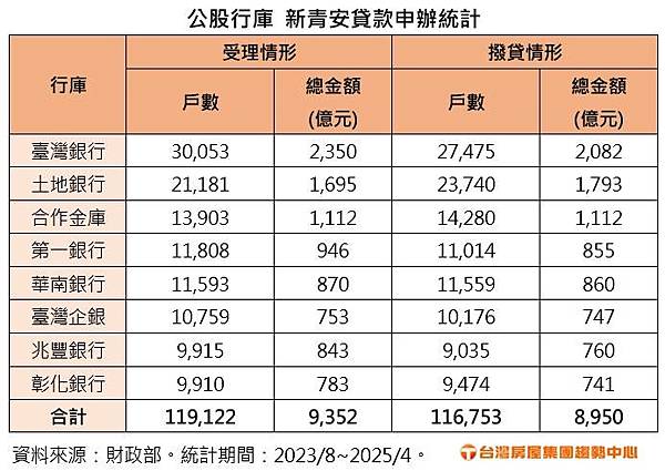 新青安於2023年8月上路,已經近2年。台灣房屋根據財政部數據,統計新青安上路以來,八大公股行庫的申辦狀況,截至今年4月,新青安共受理約11.9萬戶,受理總金額突破9300億元。