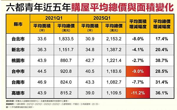 近年房價明顯上漲,初出社會的青年購屋族群若想要憑一己之力一圓購屋的夢想,難度比以往更高。業者彙整聯徵中心20至35歲青年購屋貸款,比較六都購屋青年2021年第一季與2025年第一季近5年購屋情形的差異,六都青年購屋平均總價有17~39%的增幅,但住宅的平均面積則有全面下調的情形,台北、台中與台南三都面積減幅將近1成,又以高雄市減少11.2%幅度最大,少了4.9坪,相當一間主臥室的空間。
