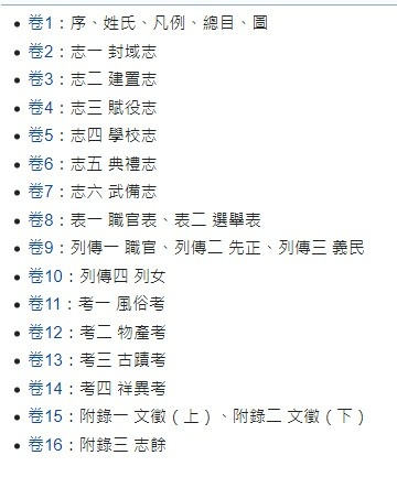 綜觀《淡水廳志》全書與一般方志差異不大,但綱目中以《卷一》、《文徵》取代修志通例《卷首》、《藝文志》,內容上亦有些許更動,稱得上是自成一格。