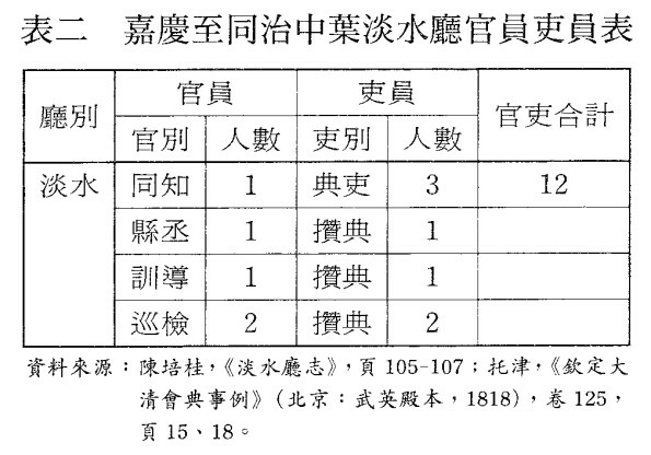 清康熙二十二年(1683)滿清征服臺灣,次年在臺灣、澎湖設置臺灣府,其下設置臺灣、鳳山和諸羅三縣。雍正元年(1723)滿清政府基於國防和治安的理由,在諸羅縣的大甲溪以北別置一臺灣府的分支機關,名為淡水廳。雍正五年澎湖設一與縣同級的廳;雍正九年淡水廳改為與縣同級的廳。自是而後至同治十三年(1874),淡水廳一直未被裁撤,其地位也一直與縣級機關相等。本篇論文內容除敘述淡水廳的設置情形外,首先分析淡水廳及其附屬官署之巡檢、縣丞、儒學的組織和職掌;其次探討淡水廳之使用經費分配與官員差役之待遇;再次是考察淡水廳之首長(同知)的任期、差役之待遇、官員之任期,和官員出身之族別、籍貫、學歷等課題都有統計數據,藉以增加讀者對問題的瞭解更具體的印象。