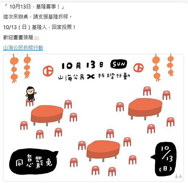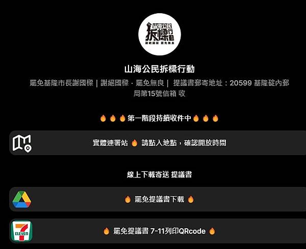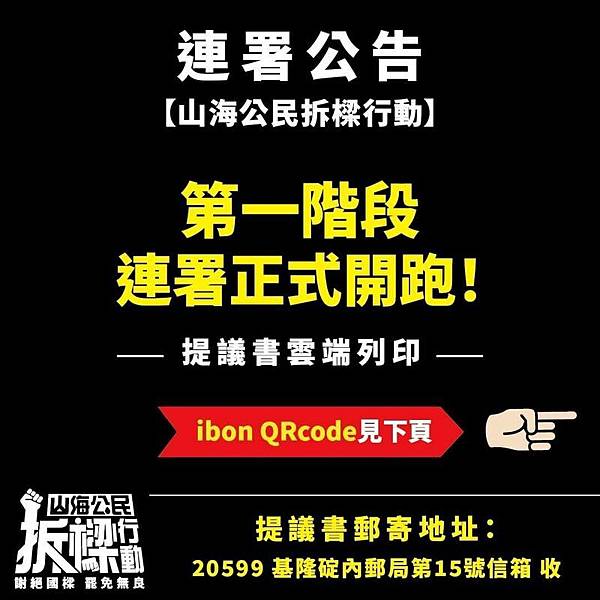 發起「山海拆樑」第1階段連署行動,提醒支持者填寫連署書應該注意事項,包括參與連署者必須年滿20歲,設籍基隆市,滿4個月者,皆可連署。