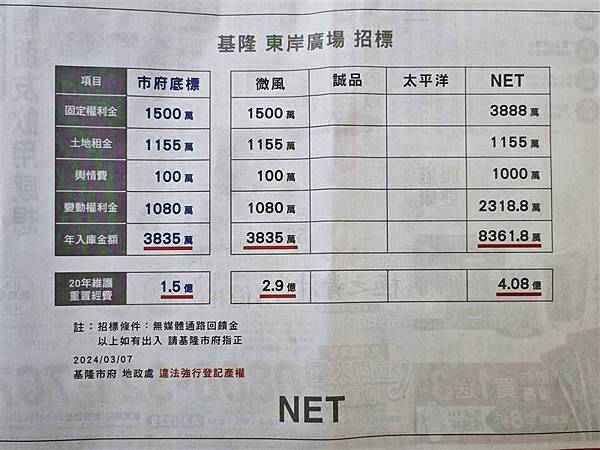 對於基隆地政事務所於3/7完成登記東岸商場2至4樓產權給市府,NET公司今發聲明回應,該公司與基隆市政府對於包括由NET出資新建之地上二至四樓建物之歸屬、招標過程合法性等原存有意見不同之處,NET遵照我國司法制度,於去年12/7向基隆地方法院民事庭提出確認所有權之訴訟,期透過法院審理程序公平表示意見,並以判決作為爭議解決的依歸,尋求民主法治社會的正途。
