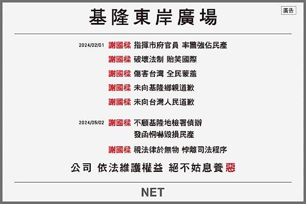 NET表示,深感遺憾的是,基隆市政府自知相關建物產權尚在訴訟進行當中,卻未待法院判決、未循合法程序,在無立即性及必要性之狀態下,於今年2/1凌晨濫用行政權、警察權,強行接管基隆東岸商場,使大量被指派執行基層公務員、員警陷入重大違法風險;而在此濫權執行的突兀行動受到社會矚目,引起軒然大波後,基隆市政府高層人員未置合理說明、亦未表示任何悔意,不願承擔行為的責任,反為遮掩此爭議行為的適法性討論,將衝突拉高成各種社會對立,以模糊焦點。