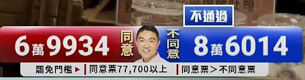 三、同意罷免票數超過罷免門檻76979票,不同意罷免票數高於同意罷免票數,但領先幅度相當小(如5千票以內)。罷免案雖沒過關,但已嚇出藍營一身冷汗,未來謝國樑施政將備受挑戰,2026連任也會特別艱辛。