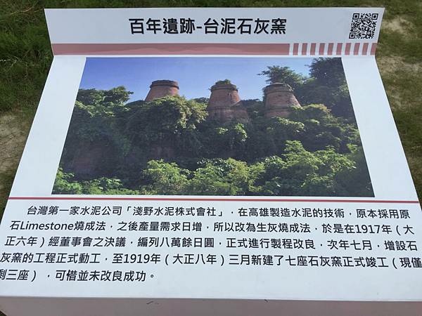 這三座石灰窯高約十二公尺、寬約六公尺,是用紅磚環繞上堆砌而成,其存在歷史比起台灣水泥公司的歷史的還要久。希望高雄市政府能將其列為產業文化資產,永久保留,將步道規劃好並增設解說牌,讓更多民眾也能有機會一睹它們的風采。也順便在此呼籲遊客們,共同愛護這些古績,不要任意破壞或製造垃圾,讓這三座歷史悠久的石灰窯,成為我們高雄最具價值的文化資產之一。石灰窯 https://bit.ly/3TtCWf0