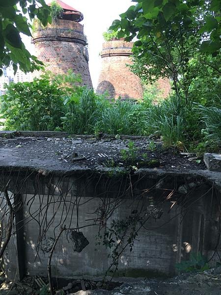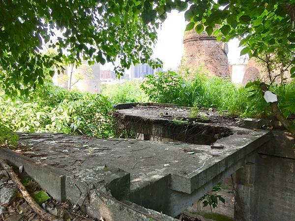 照片為台灣水泥高雄廠(台泥鼓山廠)廠區石灰窯。於荒煙蔓草之中,百年石灰窯的基本設計,皆為上細下粗的圓錐柱狀,頂端仍保存煙囪蓋頂。