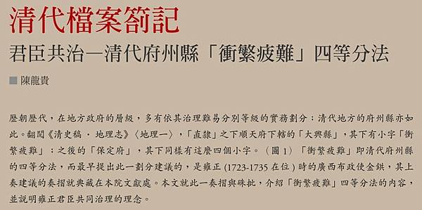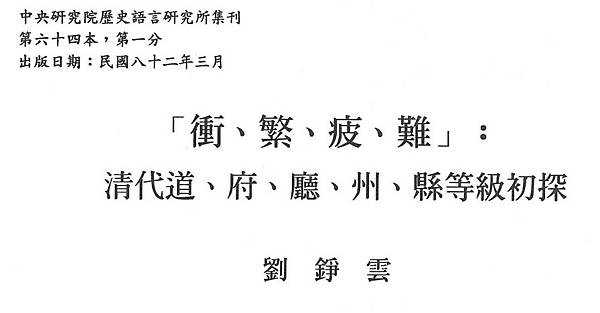 「衝、繁、疲、難」:清代道、府、廳、州、縣等級初探- 元照出版, 月旦知識庫 https://bit.ly/3T2bfIE