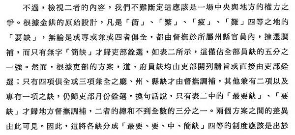與山西省相仿,其他各省亦均遵循諭旨,把四要素與四等級對應起來,將四、三、二項之缺分別與最要缺、要缺、中缺對應,一項和無項之缺並在一起,與簡缺相對。這是「沖繁疲難」制度發生的重要變化,也為舊制度向新制度演進邁出了關鍵的一步。
