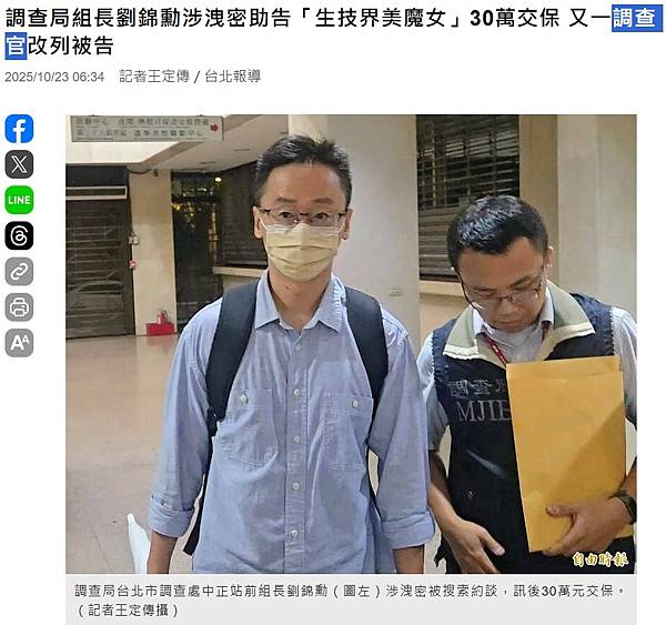 調查局組長劉錦勳涉洩密助告「生技界美魔女」30萬交保 又一調查官改列被告 - 社會 - 自由時報電子報