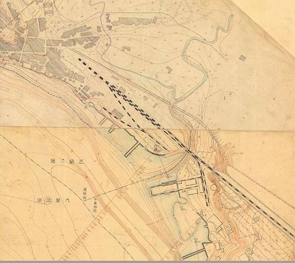 淡水站周邊地圖,南側岔出支線往殼牌倉庫(圖片來源:台灣百年歷史地圖─淡水港市街圖(1913))