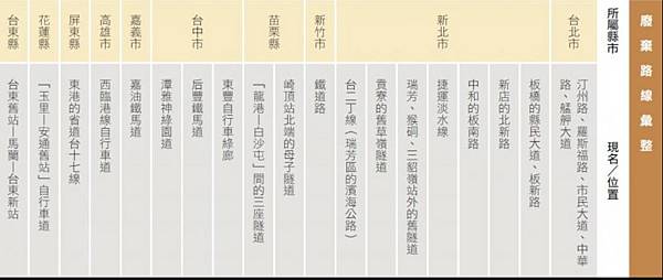 棄路線就是以前曾經有鐵道經過的地方,因為某種因素而拆除。最明顯的例子就是已經被拆除的幾條支線,有興趣的讀者可以沿著原路線走走看,緬懷往日風光,有時可以發現一些遺跡,例如深澳線停辦客運時的終點海濱車站和月台都保存良好;東勢線的東勢車站仍存,只是被改建,部份鐵軌都還可以看到痕跡。東勢線現為東豐自行車綠廊。