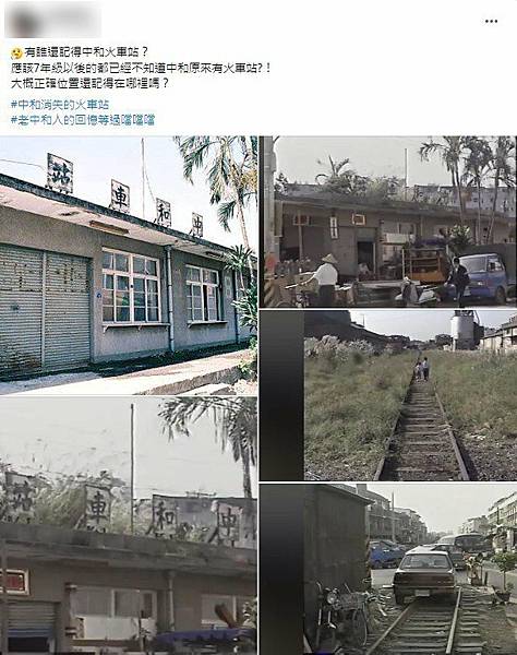 原PO在臉書社團「我是中和人」中貼出數張照片,好奇發問「有誰還記得中和火車站」,只見照片生動呈現拆除前的中和車站、以及站前人們生活、走鐵軌的樣貌,勾起滿滿回憶。他又再進一步表示「7年級」以後的網友可能都不知道中和曾經有過火車站,也不知有多少人還記得大概正確位置在哪?
