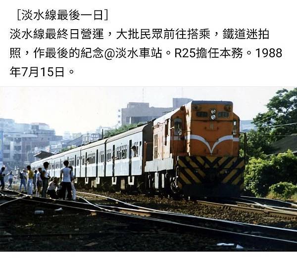 上面照片是民國七十七年七月十五日左右台北後火車站第六月台開往淡水的最後一班列車(真正最後班車是22:45),台鐵服務人員(應該是站長)和大家揮手道別,列車上人擠得是滿坑滿谷,大家都想和這位也許從日治時期(1901年完工通車)到目前為止陪伴百年以上的老朋友道別,尤其是淡水沿線火車的通車勤族、逃票族和不滿足等等,都是覺得有些不捨,但是也對未來即將興建的淡水線捷運有更方便、更安全及更舒適的運輸能量。