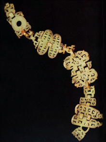 十六節龍鳳玉佩1978年出土於湖北省隨州市西北郊擂鼓墩曾侯乙墓東室墓主棺內。全長48釐米,寬8.3釐米,由13片鏤空的各種形式或圖案的玉片及24個圓環、半圓環或方扣連接而成。其中有4個銀挺玉插入,拆卸銀挺玉之後便成為5塊長度不同、環片多少不等的連環玉佩。摺疊起來便形成一塊玉團狀。第1塊玉有二片二環,第2塊玉有三片六環,第3塊小玉僅有二環,第4塊玉有三片四環,第5塊玉有五片六環。