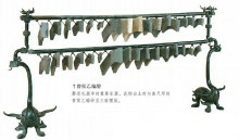 青銅錯金磬架,通高109釐米、寬215釐米,由一對圓雕怪獸及其頭上插附的立柱為虡,兩根圓杆作橫樑,呈單面雙層結構。獸頂插附的立柱從腰、頂兩處與橫樑榫接。橫樑底等距焊鑄銅環,以串鈎掛磬。磬架施線條流暢的錯金雲紋。青銅錯金磬架,其磬架之精美、磬塊之眾多、編懸之明確、配件之完備,在考古發現的樂器中獨一無二。