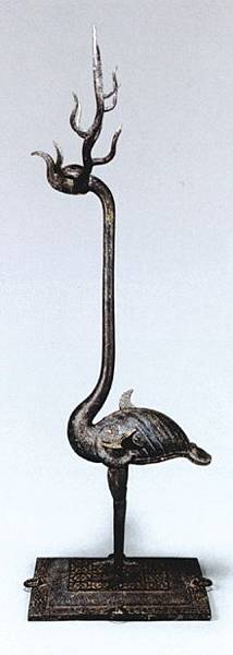 此器造型別致,是一件獨具風格的青銅工藝精品。鶴和鹿是長壽和吉祥的象徵。把鹿角插入鶴頭,將二者置於一身,可稱之為“瑞鶴”。古人把仙人乘車叫“鶴馭”、“鶴駕”。此器出於墓主人棺側,可能反映了死者成仙昇天的思想。