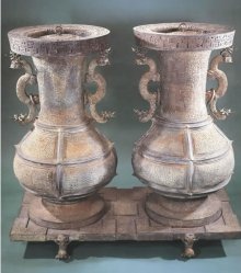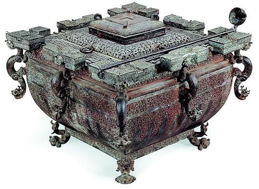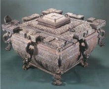 這是古代用以冰(温)酒的器具,通高61.5釐米、邊長62釐米、重170公斤。它由內外兩件器物構成;外部為鑑,鑑內置一尊缶。鑑與尊缶之間有較大的空隙,夏天可以放入冰塊,冬天則貯存温水,尊缶內盛酒,這樣就可以喝到“冬暖夏涼”的酒。