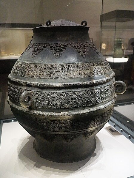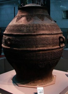 尊缶為古代盛酒器,通高124.5釐米、口徑48.4釐米、足徑69釐米,重327.5千克。這件大尊缶是所知我國先秦酒器中最大、最重的一件,堪稱“酒器之王”。它不但擁有足以傲視同類的巨大體型,而且在紋飾上也極盡精美,器表由細密複雜的渦紋、重環紋、蟠螭紋、綯紋、雷紋、蕉葉紋、帶紋、蟠蛇紋等構成,花紋花式統一,線條整齊劃一。大尊缶出土時,裏面還存有酒液。歷經二千四百多年沒有泄漏,可見缶的密封性之好。這件大尊缶不僅為我們瞭解曾國的人文歷史提供了珍貴實物資料,而且也讓人感受到了當時貴族的豪飲之風。