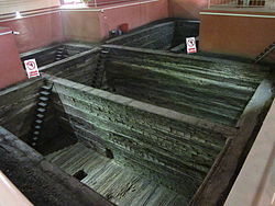 隨着水位一點點下降,人們發現這是一個豎穴木槨墓,掘於紅色沙礫岩之中,平面為多邊形,沒有墓道。墓坑東西長21米,南北寬16.5米,深度在13米以上。木槨共有12道槨牆,槨高3.1米~3.5米,由171根長條木板壘成,達380立方米。墓室按方位分東、中、西、北四室,均為長方形,中、北、東三室寬度一致,均為4.75米。