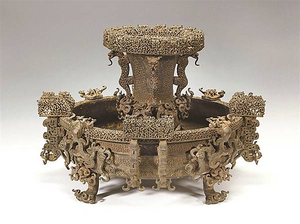 禁面有兩個並列的中空圓圈,以承放大壺圈足。禁的長邊各有二獸足。獸口部和前肢銜託禁板,後足蹬地。禁面和側面均飾蟠螭等紋飾。