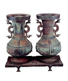 壺為敞口,厚方唇,長頸,圓鼓腹,圈足。左壺通高99釐米、口徑33.8釐米、蓋罩徑53釐米、底徑40.6釐米、重106公斤;右壺通高99釐米、口徑32.6釐米、蓋罩徑53釐米、底徑40.6釐米、重99公斤,銅禁長117.5釐米、寬53.4釐米、高13.2釐米、重35.2公斤。壺蓋有銜環蛇形鈕,蓋外沿套裝勾連紋的鏤孔蓋罩。壺頸兩側各有一攀附拱屈的龍形耳。器身飾蟠螭紋和內填蟠螭紋的蕉葉紋等。兩壺內壁均鑄有“曾侯乙作持用終”銘文。