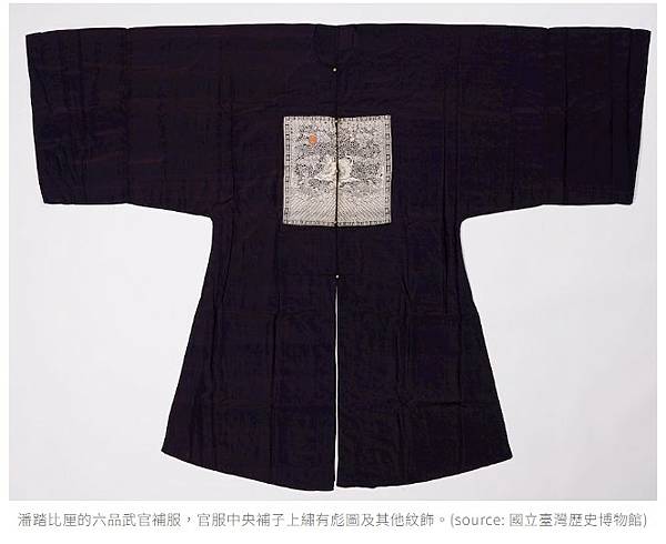 潘踏比厘的六品武官補服,官服中央補子上繡有彪圖及其他紋飾。(source: 國立臺灣歷史博物館)