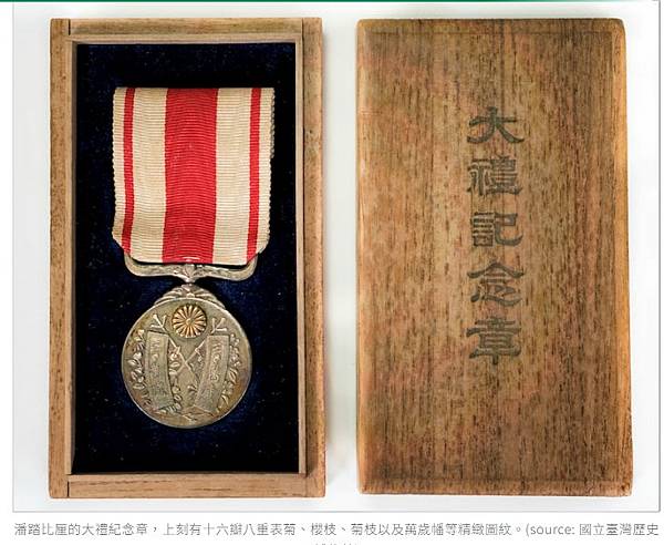 那枚別具意義的紳章沒有留存至今,可能是在潘踏比厘辭世後,後人依照規定,將紳章繳還給政府了。不過,他還是留下一枚銀質的「大禮記念章」,是 1915 年 11 月為大正天皇舉行登基儀式所打造,圖紋相當精緻。持有這枚獎章,同樣能見證他在日治時期擁有的特殊地位。