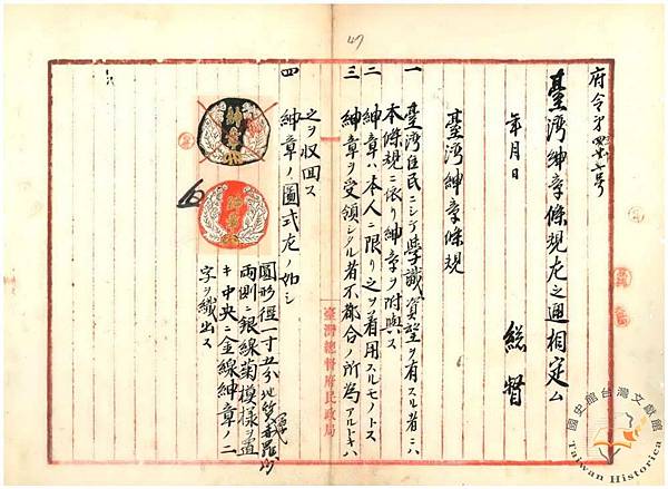 如此,總督府當局遂於明治二十九年十月二十三日以府令第四十號發布「臺灣紳章條規」。實則,紳章制度乃為總督府為拉攏臺灣士紳、富豪而頒行的榮譽章制度,此從總督府急切希望於明治三十年(1897)五月八日臺灣人決定國籍期限前頒發紳章一事即可見其一端。按「臺灣紳章條規」及其辦理內規(即「臺灣紳章條規取扱內規」)規定,紳章的授與對象為具有學識資望之臺灣住民。所謂具有學識,是指參加舊清時期政府考試的成績或學力程度及經歷(科考功名);所謂具有資望,是指資產多寡、地方名望程度及其事由。請頒紳章時,須由地方首長彙整相關個人資料提報臺灣總督府,經臺灣總督核可後,始得發給紳章。紳章只限本人佩用。佩用者行為不檢時,地方首長須報請總督收回,總督核可後,由地方首長執行收回紳章送交總督府民政局。紳章佩用者死亡時,由其遺族繳回。