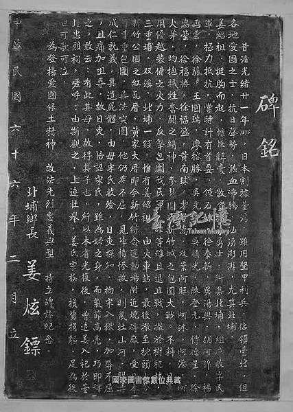 所以本省光復後,曾追姜入祀於臺北忠烈祠。嗟呼!由斯觀之,上述壯舉,姜氏宗族,捐資捐驅,足為後世可歌可泣。為發揚愛國保土精神,效法先烈忠義典型,特立碑誌紀念。