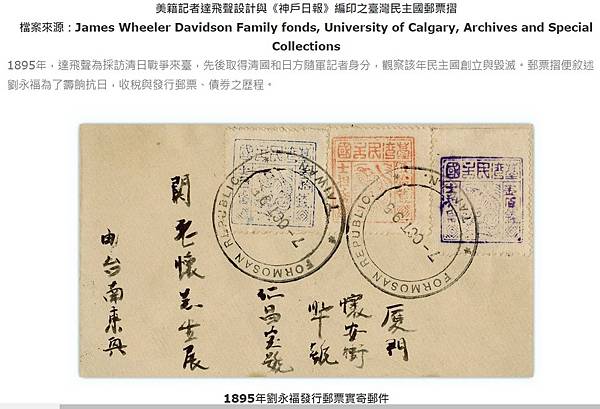 達飛聲(James Davidson)先後為紐約前鋒論壇報等多家報社工作,後來還曾擔任美國駐台外交官,並參與國際扶輪社。他過世後,畢生文物典藏於加拿大University of Galgary。中研院台灣史研究所今天舉辦的「翻轉1895—乙未之役120年檔案特展」,展出達飛聲與台灣乙未之役相關的複製品。