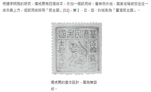 獨虎票以老虎為圖案,是1895年時,台灣民主國為籌措抗日軍餉而發行的郵票。左方的“士擔幣”三字即是“郵票”的音譯。該宣言系由陳季同所起草,於1895年5月24日將宣言的英文譯文送給在台北的各國領事館。宣言內容主要為:
