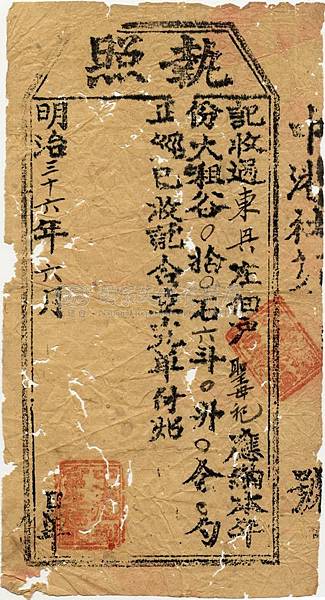 執照、記收過、東興庄租戶聖母祀、應納本年份大租谷零拾零石六斗零升零合零勺正經已收訖、合立完單付炤、明治三十六年六月日給