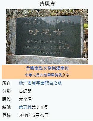 時思寺位於中國浙江省麗水市景寧畲族自治縣大漈鄉西二村,2001年被列為第五批全國重點文物保護單位。